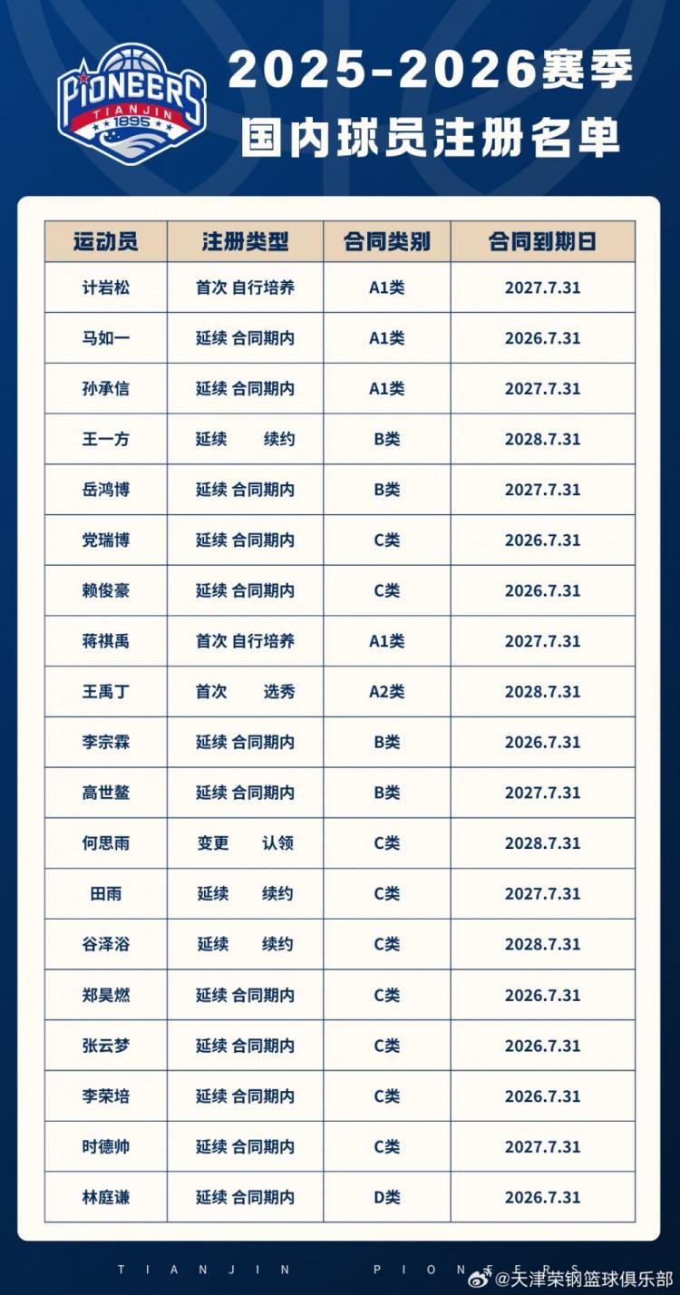 直播吧9月2日讯 今天,天津男篮官方宣布了新赛季国内球员的注册信息。原文写道:“【官宣】经CBA公司审核并完成注册公示,天津荣钢篮球俱乐部已完成2025-2026赛季CBA联赛国内球员注册工作。新赛季先行者将继续秉承“自强不息、奋斗不止、永不言败”的荣程精神,全力以赴迎接每一场比赛,向新的目标发起冲击!”在公布的名单中,只有林庭谦一人是D类合同。...